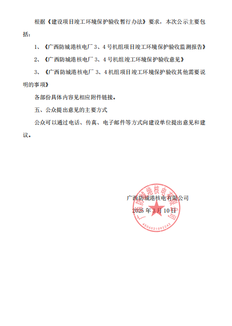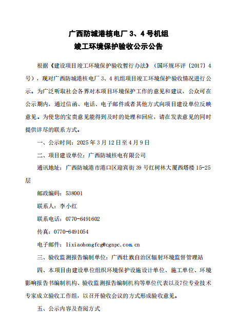廣西防城港核電廠3、4機組竣工項目環(huán)境保護驗收公示公告